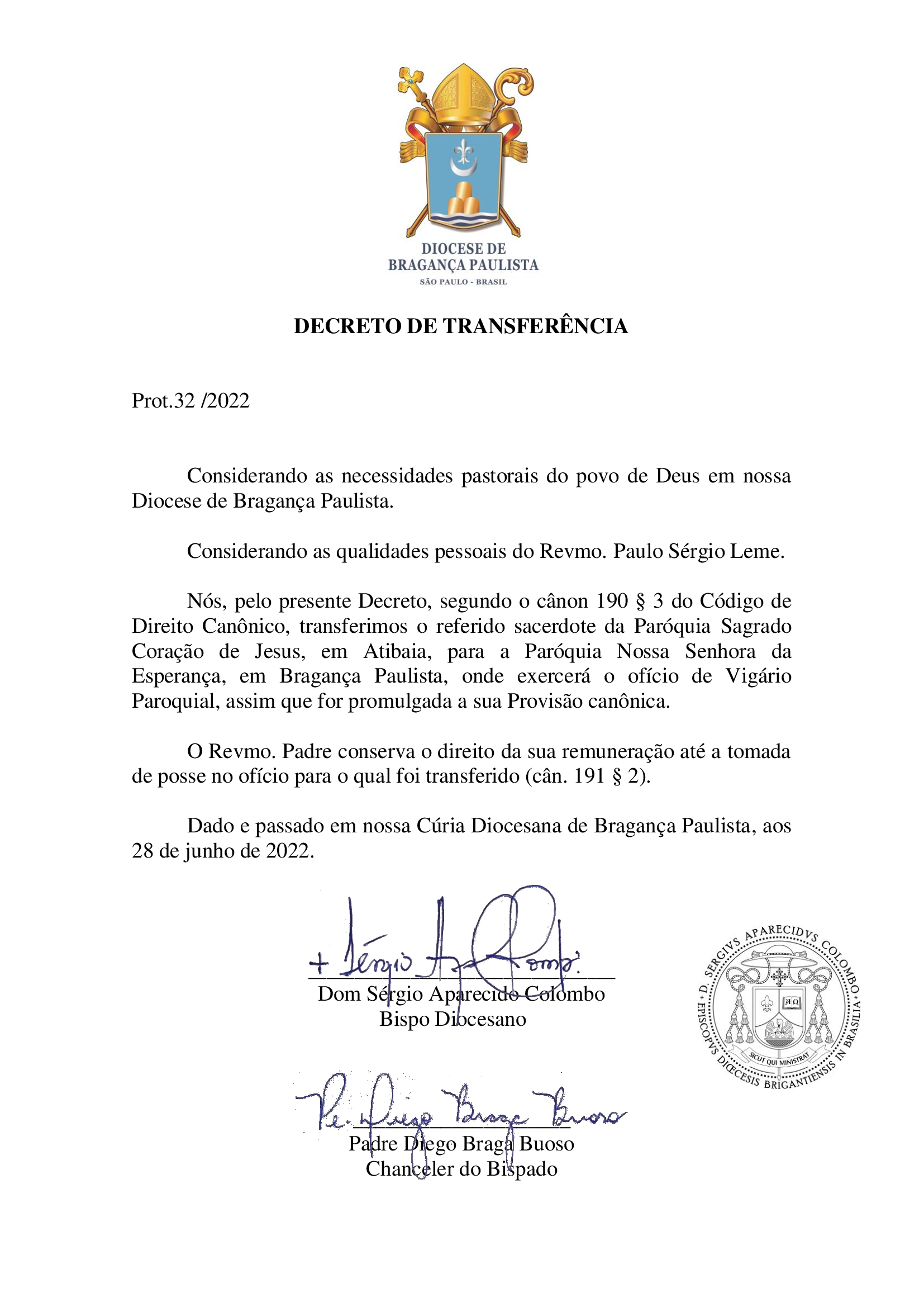Prot. 32/2022 - Decreto de Transferência - Pe. Paulo Sérgio Leme