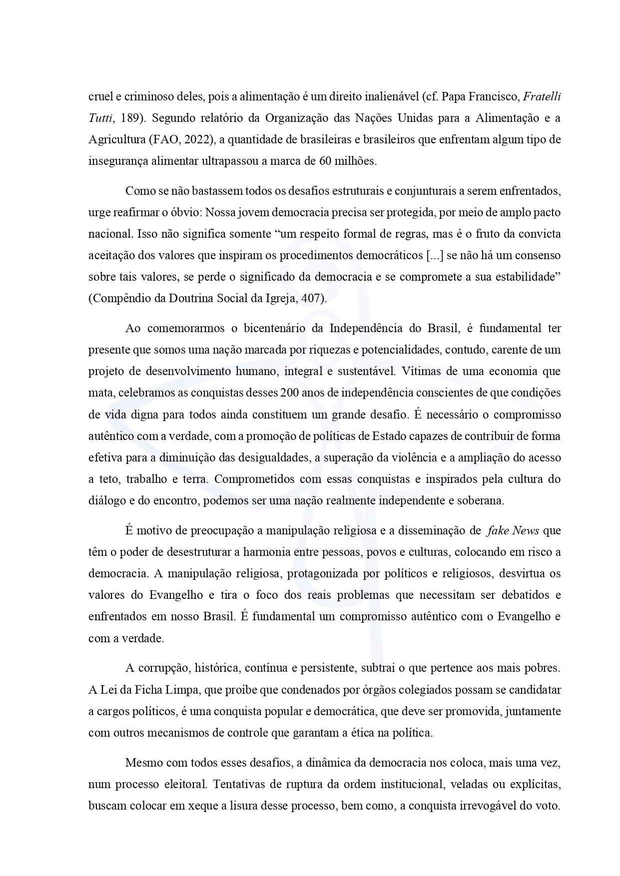 Na mensagem, os bispos conclamam, mais uma vez, toda a sociedade brasileira a participar ativa e pacificamente das eleições, escolhendo candidatos e candidatas, para o executivo (presidente e governadores) e o legislativo (senadores e deputados federais, estaduais e distritais), que representem projetos comprometidos com o bem comum, a justiça social, a defesa integral da vida, da família e da Casa Comum.